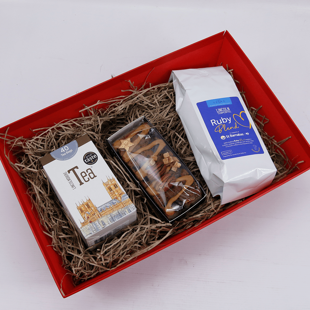 A large hamper containing St Barnabas Ruby Coffee and Tea, made by the Lincoln Tea & Coffee Company, on a white background