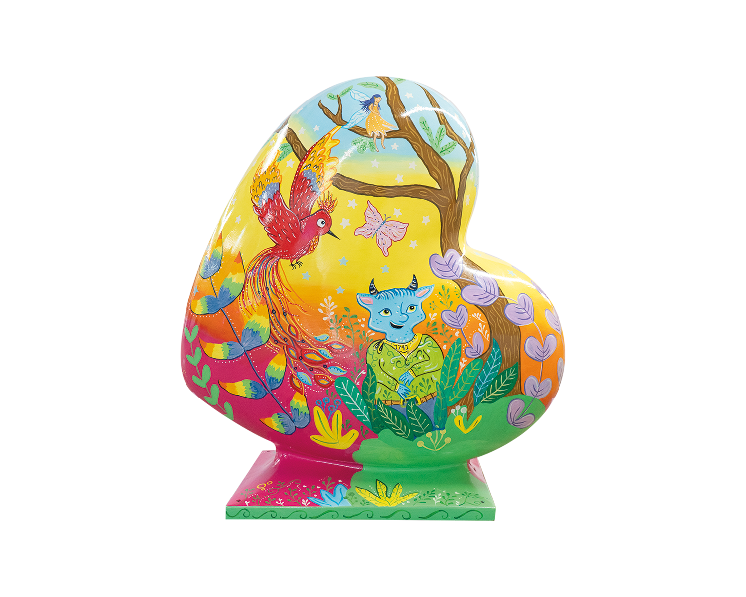 A Heart-shaped sculpture, illustrated with a design that featuring the Lincoln Imp in a magical environment. This sculpture is part of the St Barnabas HeART Trail.
