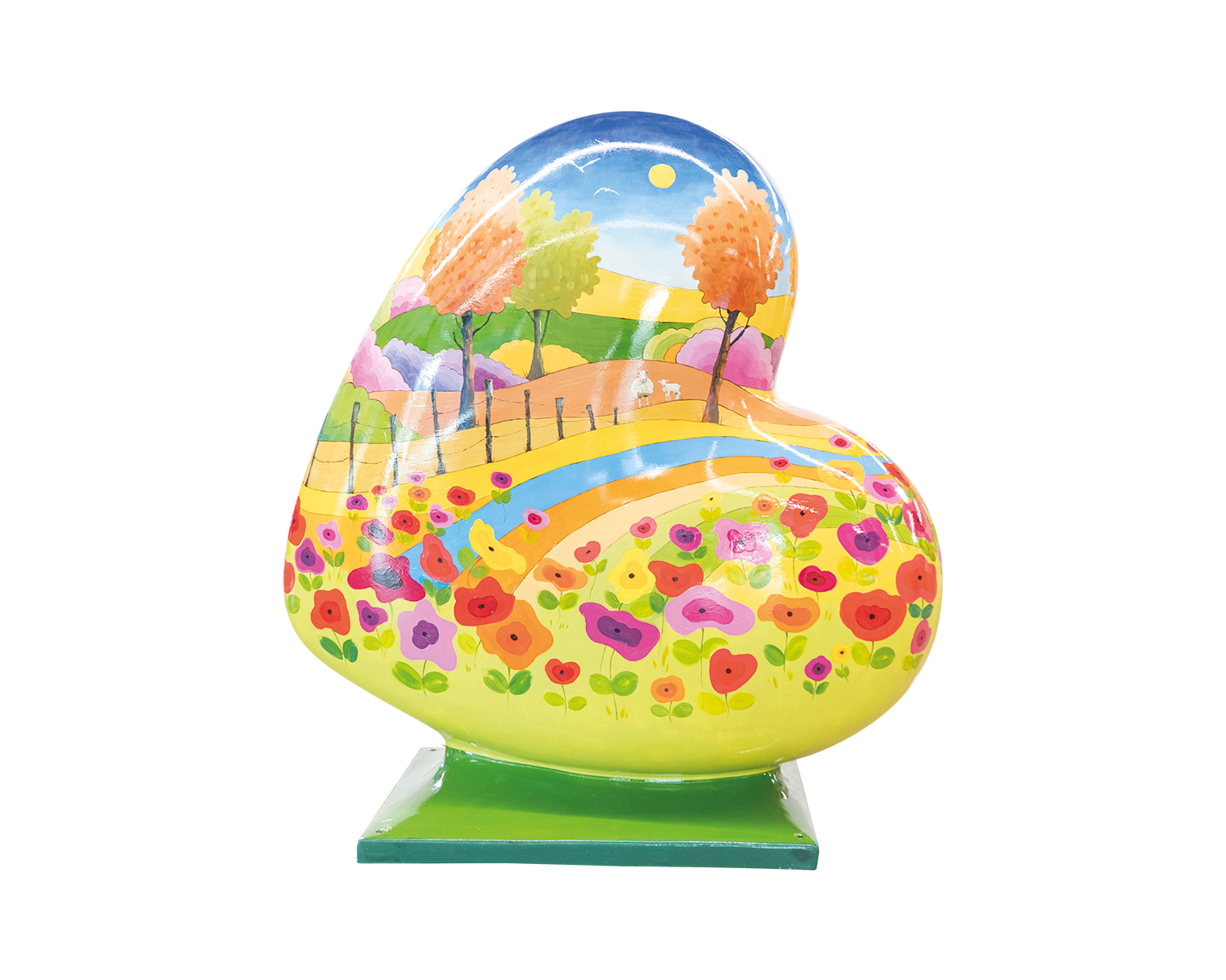 A Heart-shaped sculpture, painted with design depicting the Lincolnshire Wolds. This sculpture is part of the St Barnabas HeART Trail.