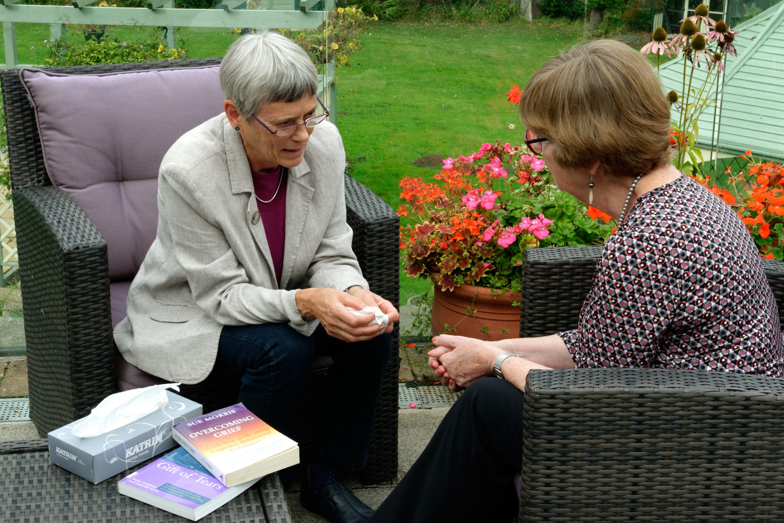 Two women in chairs in a garden, speaking. There are two books on the table with the topic of grief